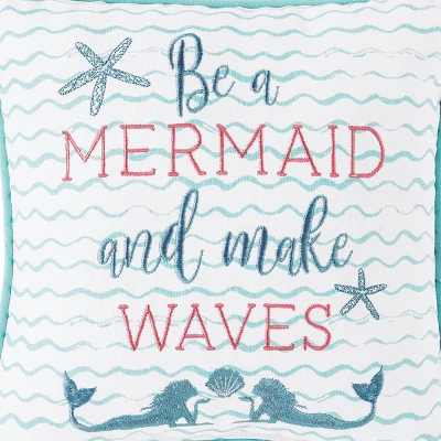 Come be a mermaid and make waves with our perfect coastal mermaid pillow. Our soft cotton design is sure to give you a chill with its blue piping, embroidered script, and its 10″ x 10″ size. Spend your day doing whatever you want with this pillow as a companion. This pillow pairs well with other patterns and colors due to its versatile design. Make a statement with this one of a kind throw pillow. Your home will feel a bit more comfy and welcoming with this beautiful pillow. A nice way to add a cozy touch to your space.