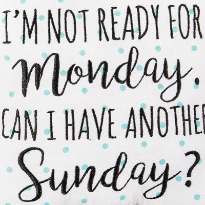 - Embroidered pillow displaying the message “I’m Not Ready for Monday, Can I Have Another Sunday?” on a playful teal polka dot background