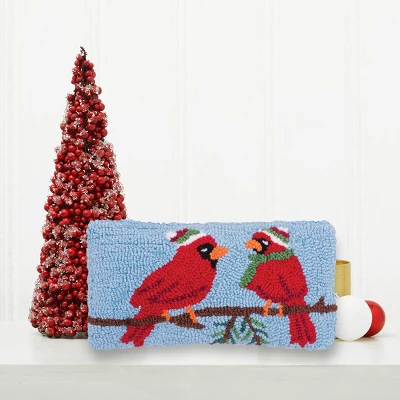 Bring a festive look to your holiday decor with this hooked gift pillow. Featuring a whimsical pair of perched cardinals upon a branch all bundled up for the cold weather with their hats and scarf in a soft blue and red colorway. This 6-inch x 12-inch pillow makes a great gift for the holiday hostess or a close friend. Crafted with acrylic yarn on cotton canvas and lofty polyester filling. Spot cleaning recommended. Size: Each pillow is 6 x 12 inches.