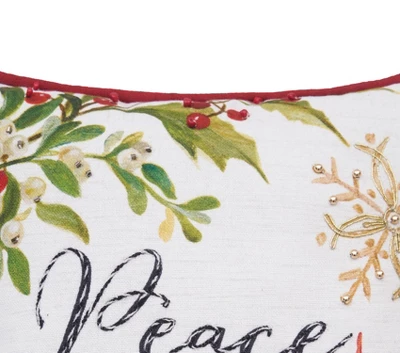 Bring a touch of inviting warmth to your home for the holiday season with the Peace Poinsettia Pillow. This classic holiday pattern is perfect to complement your Christmas decorations. With floating golden snowflakes and its beautifully dynamic floral arrangement accompanied by either “peace” or “love” typographical design, it evokes a prosperous festivity this upcoming Christmas season